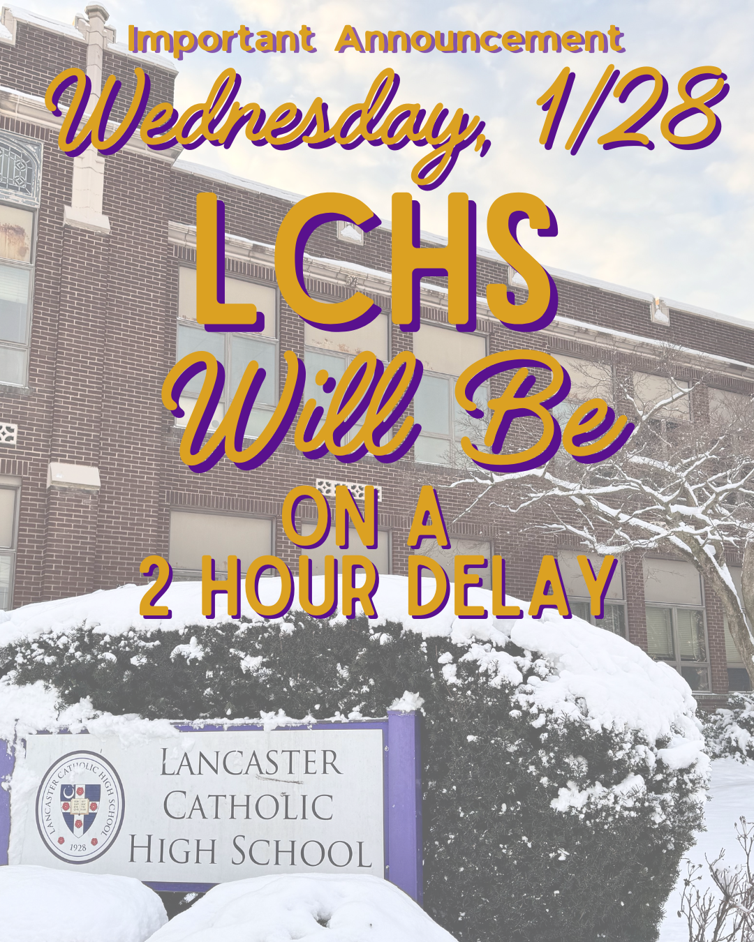 LCHS Operating on a 2-Hour Delay 1/28 Lancaster Catholic High School will be operating on a 2-hour delay on Wednesday, January 28, 2026. Print